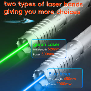 - Outdoor beam visibility and distance: 100--300 mW (green/blue).